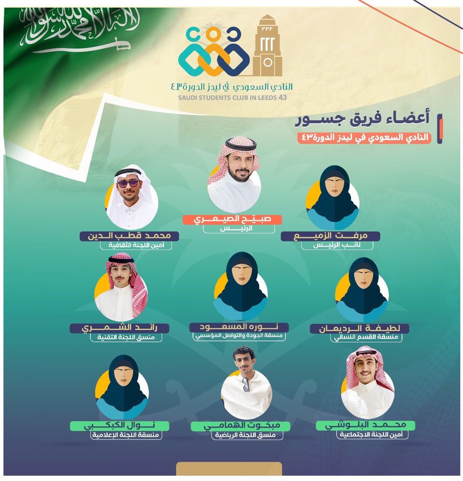 جسور ارتقاء معه ترتقي وتتطور لكي نسهم عند العودة كل في مجاله بما يخدم وطننا الغالي ويسهم في رفعته ونماءه وازدهاره من هنا استمد فريق النادي اسمه لهذه الدورة ( فريق جسور) و يطيب لنا في النادي السعودي في ليدز أن نعرض تقريرا الفعاليات وأنشطة النادي ومنجزاته، والتي تعاون فريق النادي جميعاً لتنفيذها بما يخدم جميع فئات الابتعاث المستهدفة المبتعثين والمبتعثات بمختلف مراحلهم الأكاديمية ، المرافقين والمرافقات وكذلك أبناء المبتعثين والمرافقين والتي تنوعت بين الفعاليات الأكاديمية والاجتماعية، الرياضية والترفيهية . في التطوير ومجال الخدمات وكذلك تفعيل المناسبات الوطنية والدينية.